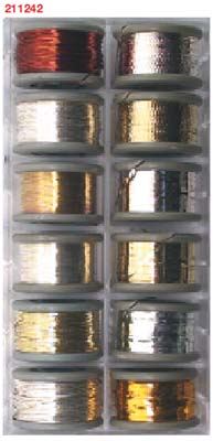 Scatoletta con 12 rocchetti di filo di colore argento, oro e rame adatti alla costruzione di mosche e ninfe.